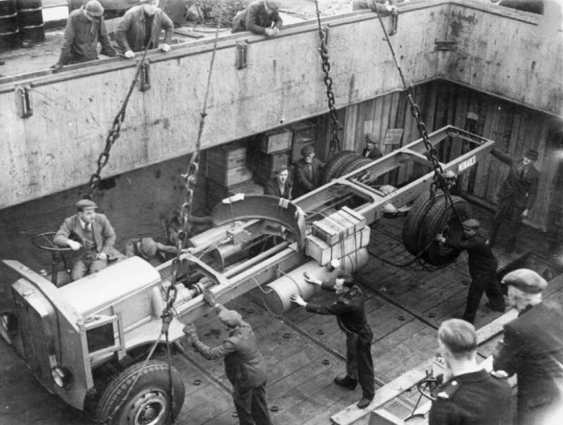 Swansea dockers lowering a lorry chassis into a ship's hold c.1940