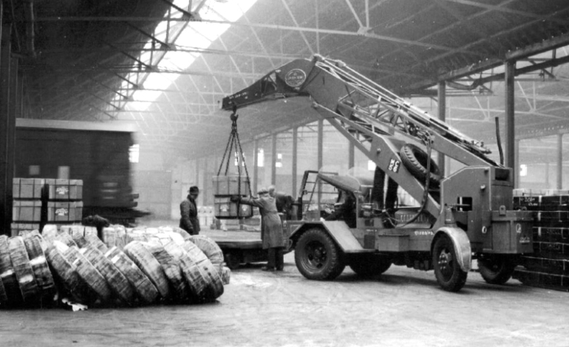 Swansea dockers shifting boxes of tinplate for export using a Taylor 'Jumbo' mobile crane