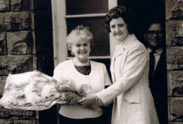 Bessie Bevan presenting flowers to George's wife Vi.