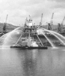 Following the disaster the ‘British Flag’ was moved to Palmers Repair Jetty in Queens Dock for temporary repairs, after which she sailed to Smiths Dock in North Shields on the River Tyne for repairs to her hull and starboard accommodation. It is interesting to note that the ‘British Flag’ incident marks the one and only time that the ‘BP Firemaster’ (see alongside column) was brought into use in almost twenty years’ service at the Queens Dock, Swansea.