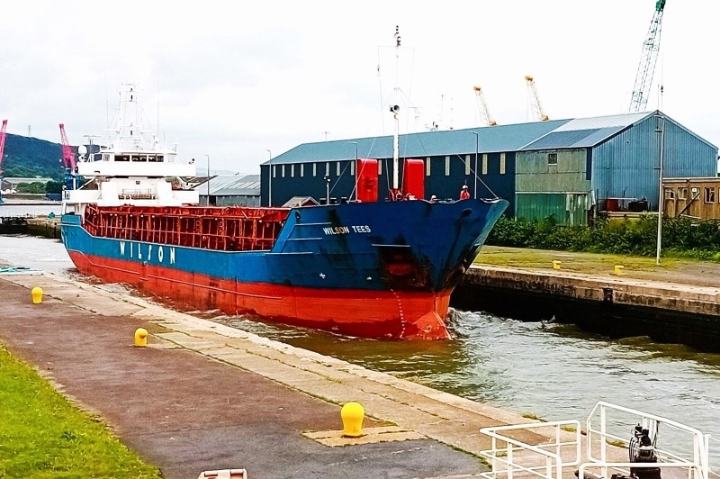 Coastal tanker Whithaven locking out after dry-docking at Swansea
