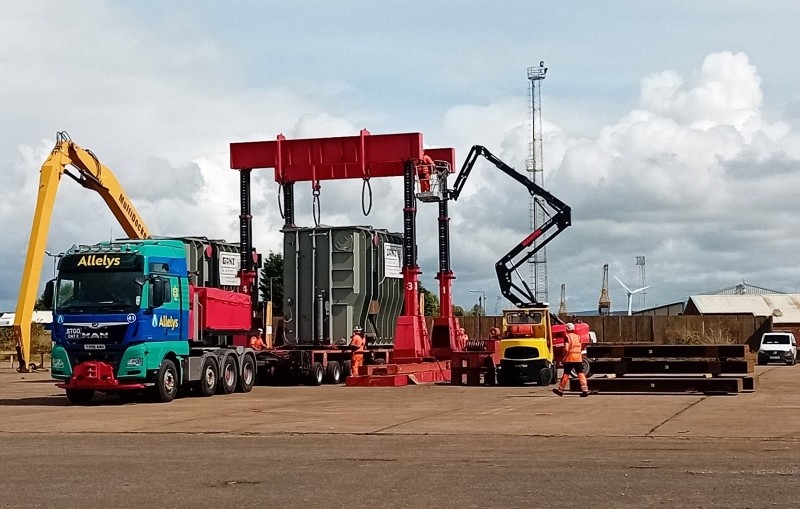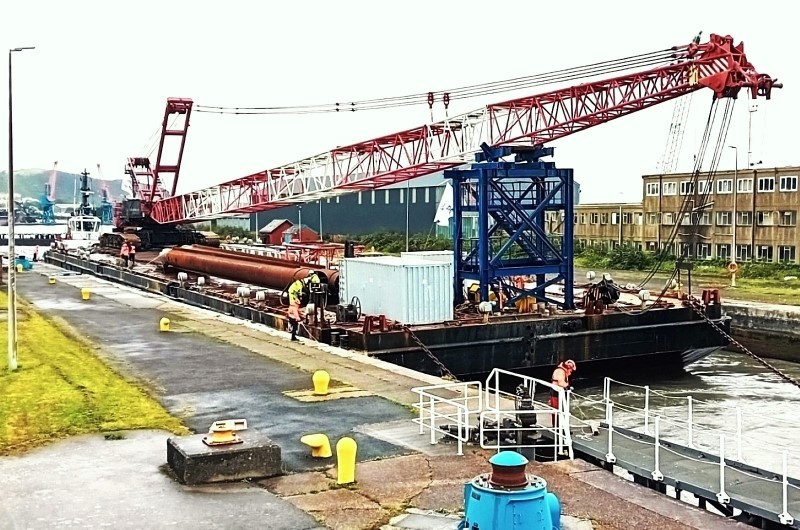 Heavy-lift pontoon H-282 with SCX 5000 crawler crane entering Swansea Docks