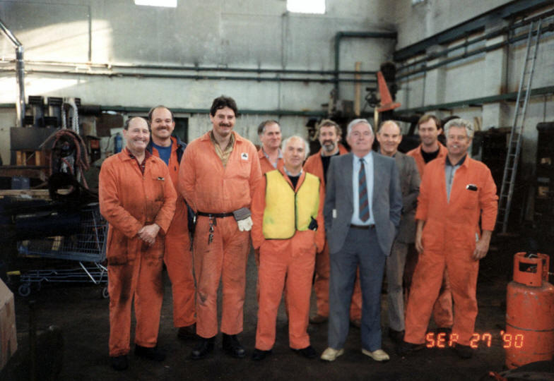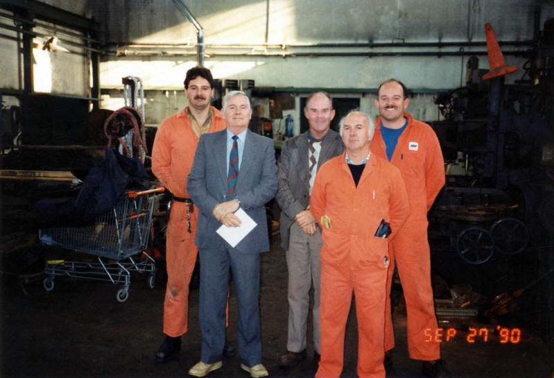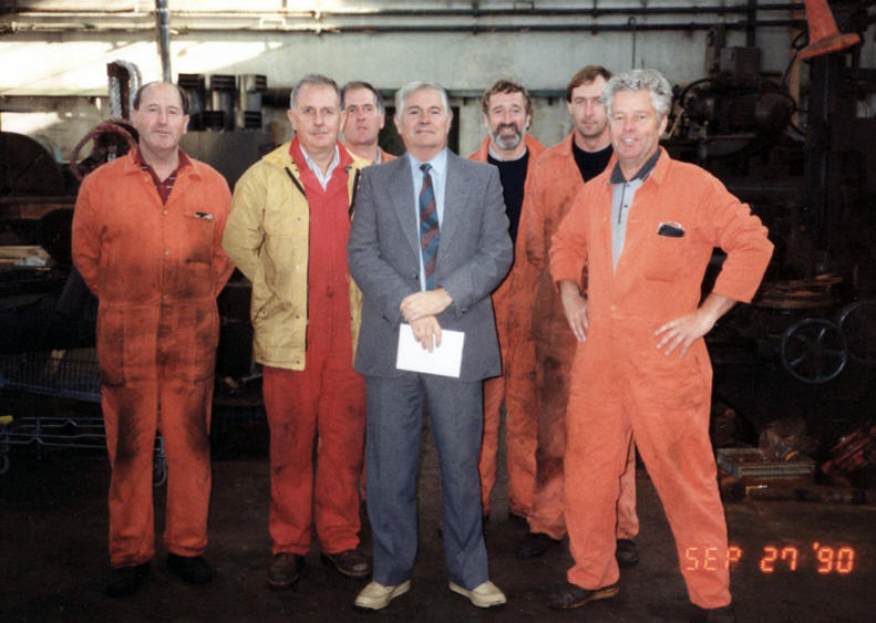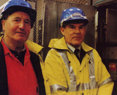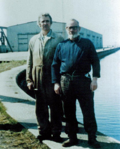 Brian Davies Mechanical supervisor & Ivor Lewis Electrical Supervisor switched off the water hydraulic pumps controlling the lock gates for the last time. A computerised oil hydraulic system has now been installed. |