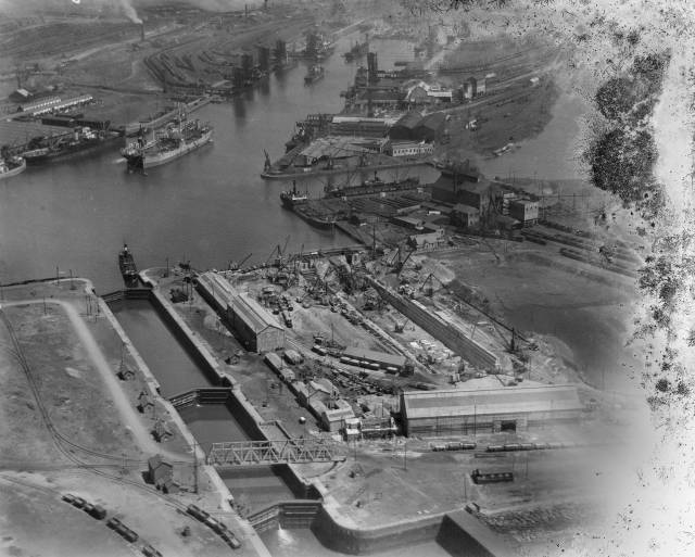 Kings Dock Lock showing Palmers Dry Dock under construction on the
