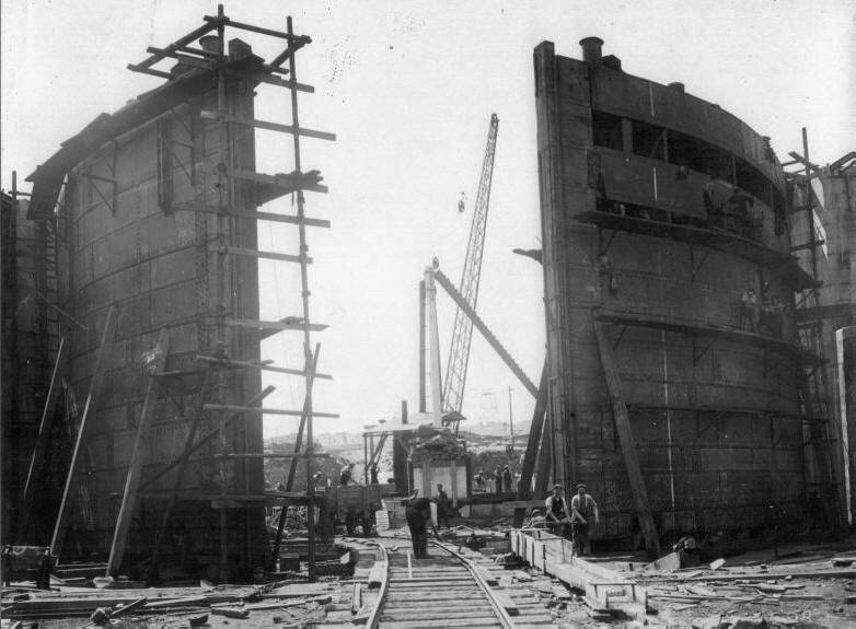 There are three pairs of lock gates installed in the Kings Dock Lock at Swansea – the outer gates numbered 1 and 6, the middle numbered 2 and 5, and the inner numbered 3 and 4. The outer and middle gates are identical in size, but the inner gates are shorter in height to accommodate the higher inner cill. The original lock gates were manufactured in 1907 by the Thames Ironworks Shipbuilding & Engineering Co. Ltd. at a cost of £38,503 5s 0d., and the contract for the lock gate operating machinery was awarded in the same year to Sir W G Armstrong Whitworth & Co. Ltd. in the sum of £4,250 0s 0d. There are also two reserve pairs of lock gates, one for the inner position and the other for either the middle or outer position. The reserve gates for the inner position were manufactured in1928 by Vickers Engineering of Barrow in Furness, and those for the middle/outer position by Fairfield Engineering of Glasgow in 1947.