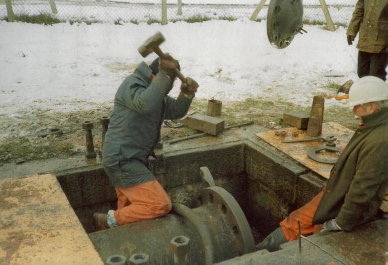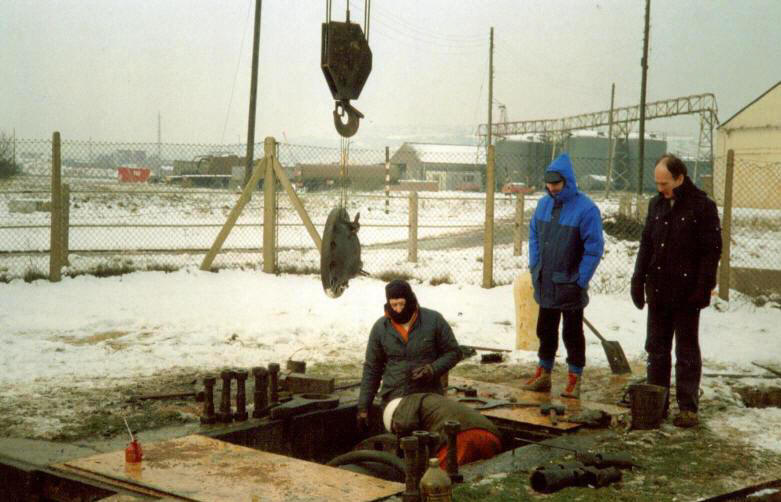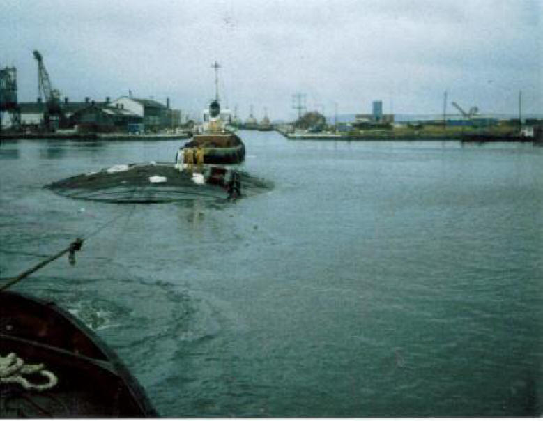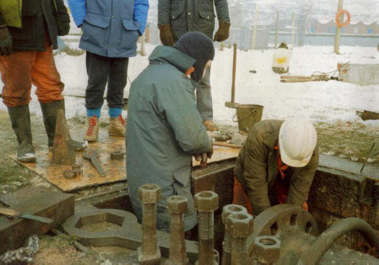 In this position, major refurbishment work could be undertaken over an extended period. Thorough cleaning, both internal and external, was followed by a detailed inspection and the subsequent replacement of any internal structural members that might have deteriorated over time. Damaged external plating was repaired or replaced by the Boilermakers. The next step was to renew the mitre, heel and cill timbers after these had been carefully prepared in the Carpenters workshop to very fine specifications. After checking the overall dimensions, the gate would then receive several coats of bitumastic paint, and replacement timber fenders would be fitted. Finally, all access manholes and scuppers would be blanked off, an air compressor attached, and the gate would be pressure-tested for leaks. Job done!