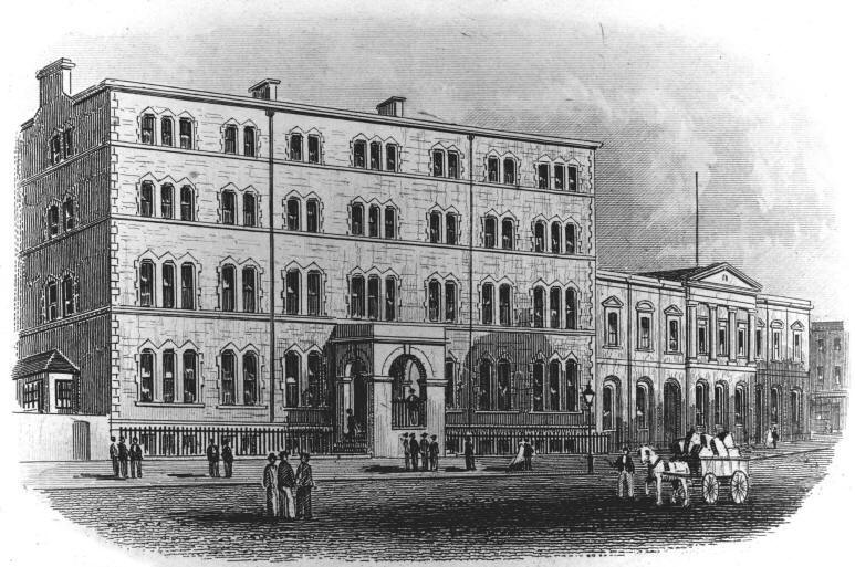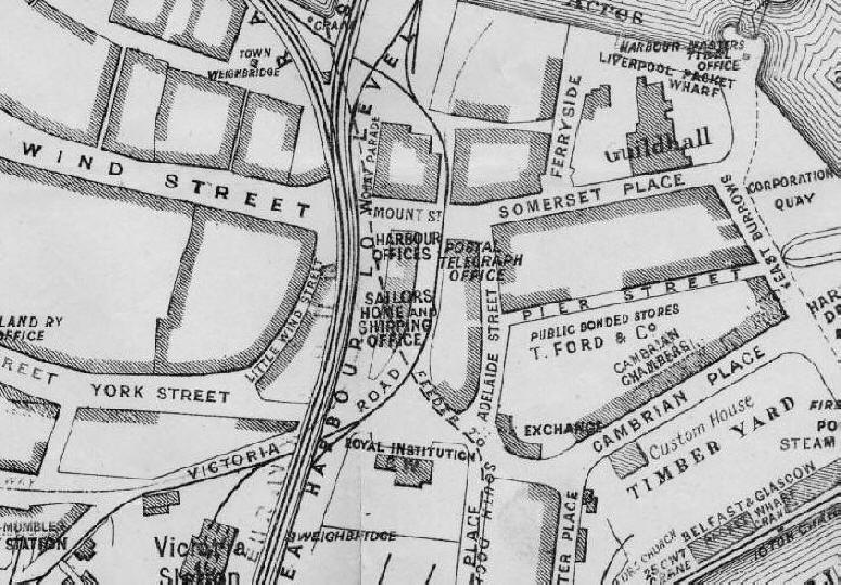 from 1865 shows the Sailors Home & Shipping Office on the left, and the