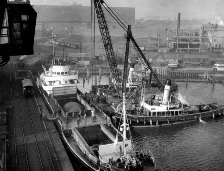 50 ton floating crane unloading part of the new Bessemer Plant from the hold of the mv Milo in July 1958. |