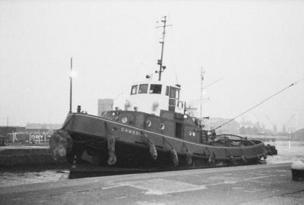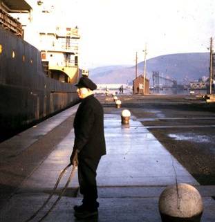 Jim Davies is on the right, William Joseph Evans on the left (Thanks to son Roy Evans for the identification). In the background the Wellpark is just clearing the locks. On the left is the tug Talbot. |