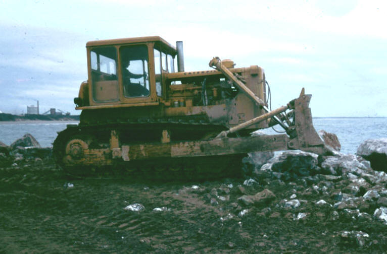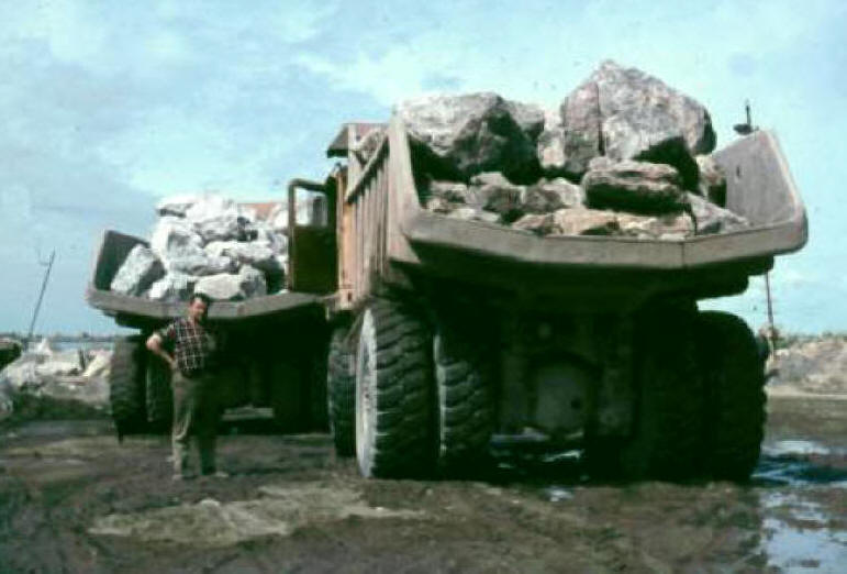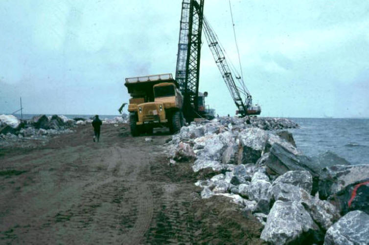 The main harbour breakwater is over 1¼ miles long, the lee breakwater one third of a mile long, and the amount of stone used in building both structures was in the region of 2¼ million tonnes. The breakwater core consists of stones of up to 2 tonnes each, and the intermediate stones vary between 3 tonnes and 6 tonnes. The main armouring on the south side of the main breakwater weighs anything up to 8 tonnes per stone.