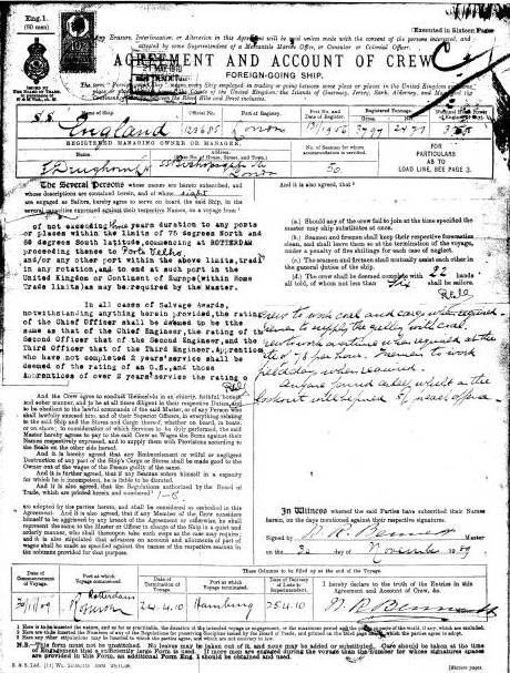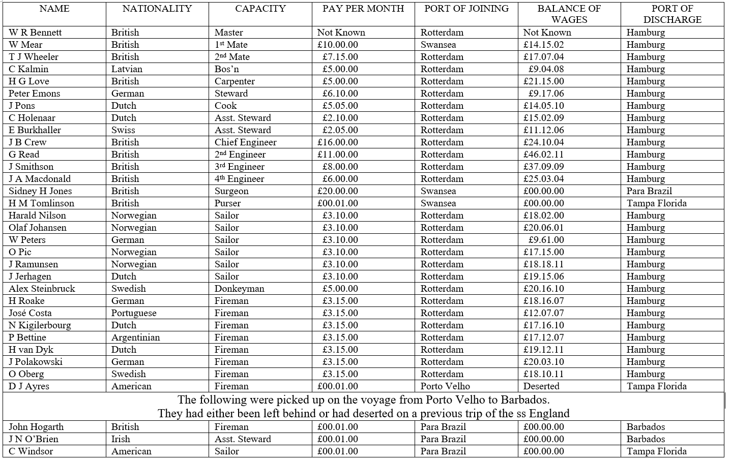 SS England crew list for the Amazon voyage