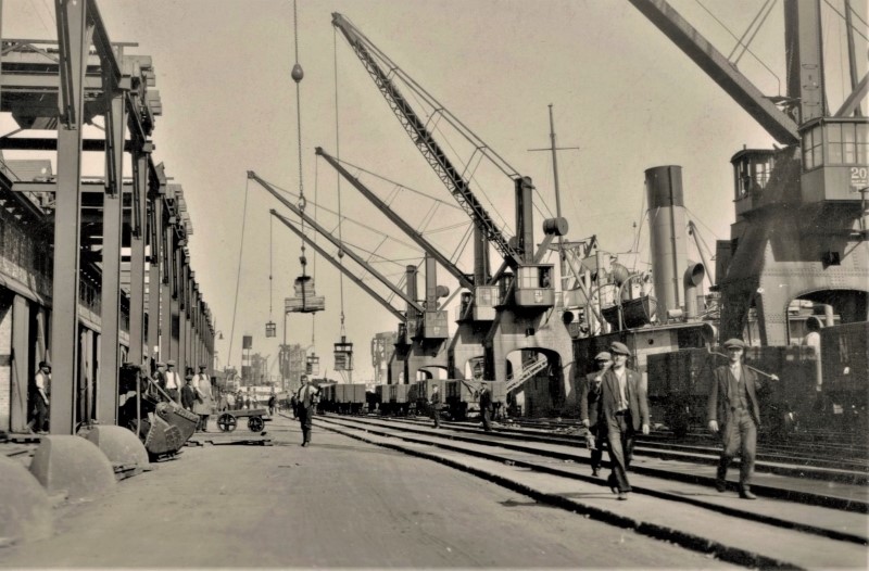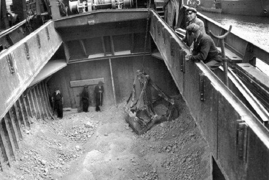 Discharging zinc concentrate by grab at No.4 Quay, Kings Dock, Swansea for the Imperial Smelting Works at Llansamlet c.1930