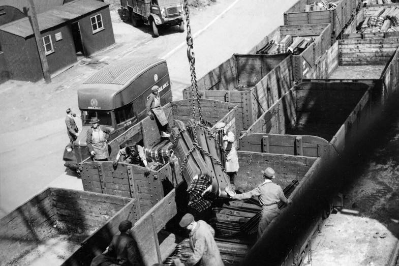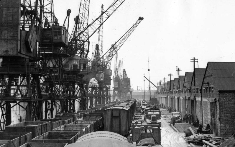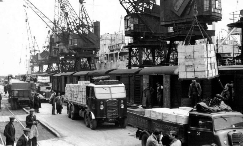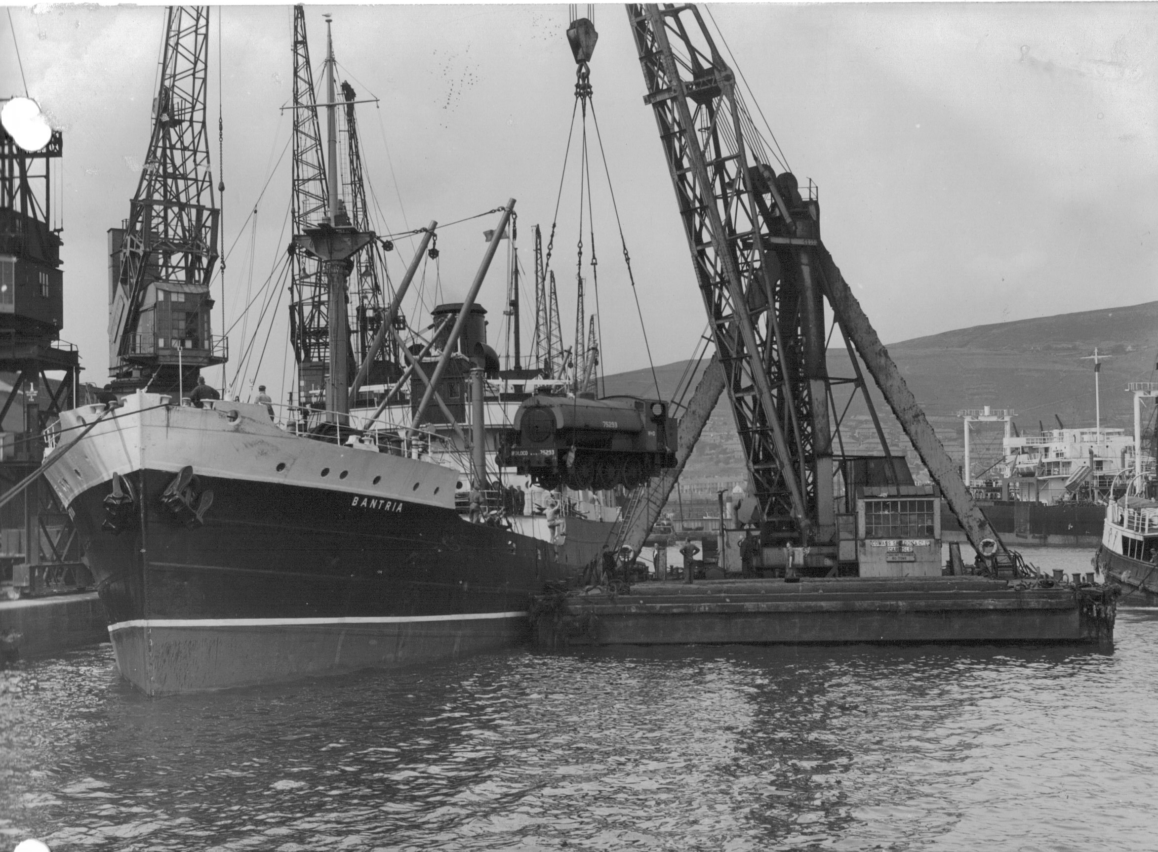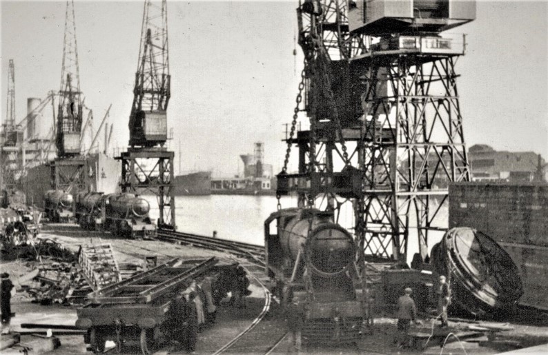 Loading Stanier class 8f locomotives with the static 70 ton hydraulic crane (out of shot) in Kings Dock, Swansea – 1941