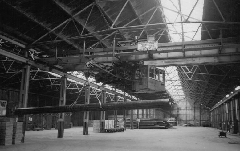 Overhead gantry in A Shed, Kings Dock, Swansea shifting steel tubes for export