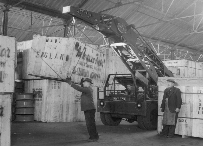 Mobile crane in D Shed, Kings Dock, Swansea handing Ferguson tractors for export – 1954