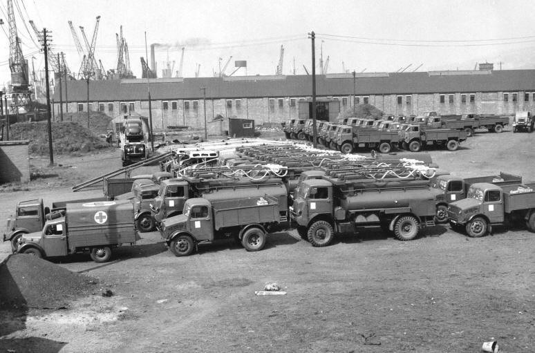 Military vehicles awaiting shipment abroad marshalled on D Shed Wharf east, Kings Dock, Swansea c.1940
