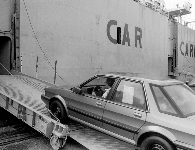 Car being driven aboard the mv Indianapolis 1989. The driver is Ian Rogerson