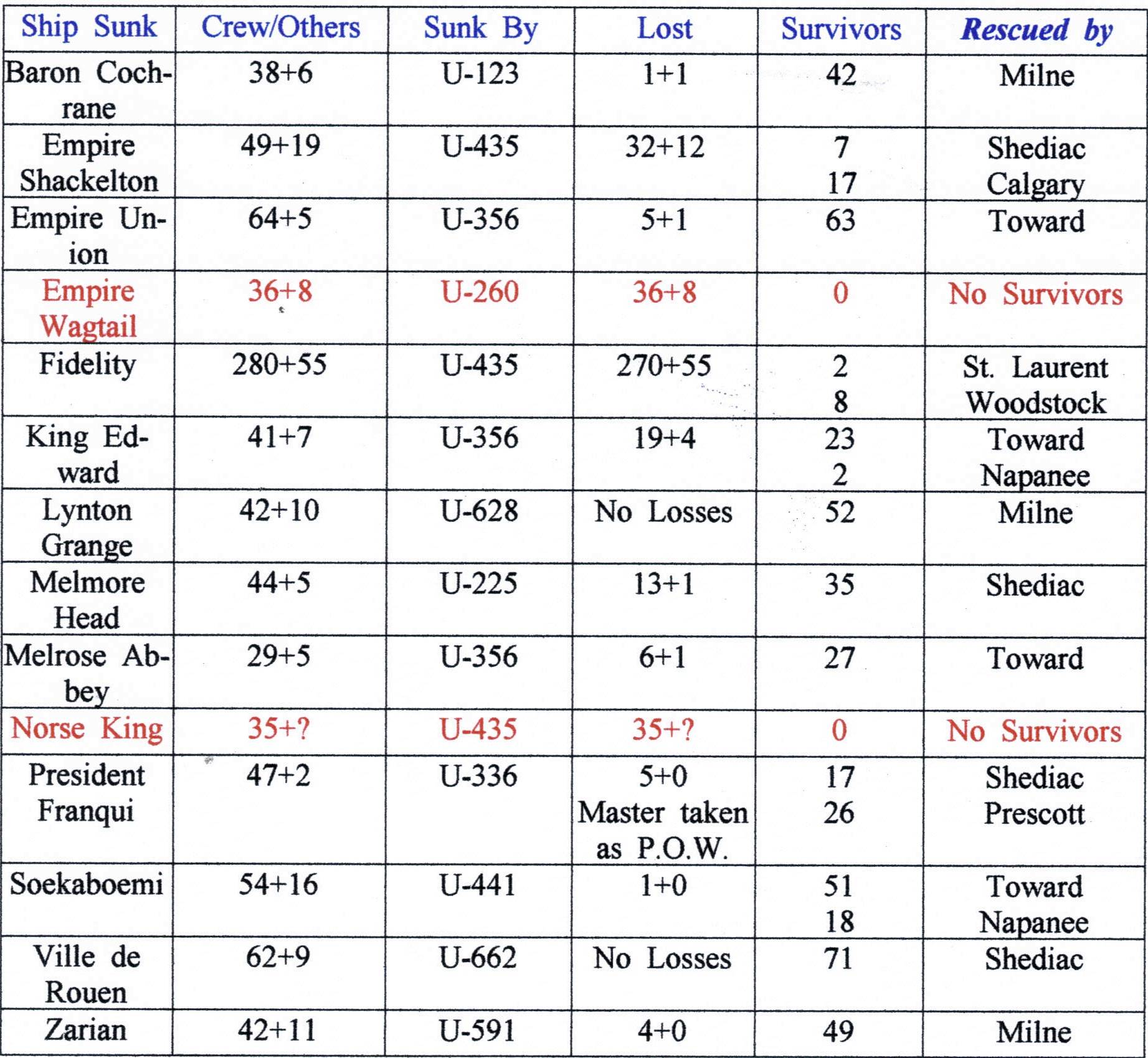 Two more ships were torpedoed by U-365, the ‘Soekaboemi’ #114 at 0410hrs and the ‘King Edward’, #81 at 0415 hrs, this vessel sinking within three minutes. At about 0730hrs the rescue ship ‘Toward’ and the corvette ‘Napanee’ picked up survivors from the ‘Soekaboemi’ and shortly afterwards the ‘Toward’ picked up a lifeboat with 23 men from the King Edward.