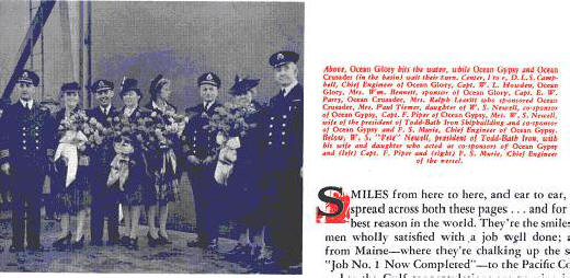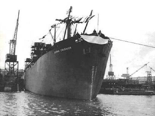The S.S. Ocean Crusader a vessel of 7,178 tons, 420’ x 57’, was launched on October 18th 1942 at the yard of the Todd Bath Iron Shipbuilding Corporation at South Portland, Maine. She was one of three vessels launched that day, the others being the Ocean Gypsy and the Ocean Glory, which both survived the war, trading until the 1960’s. The launching of these vessels brought the total number at this yard, for the previous two months to 16 vessels. These 3 ships were the last of the 30 vessels ordered for the British Government at this yard. |