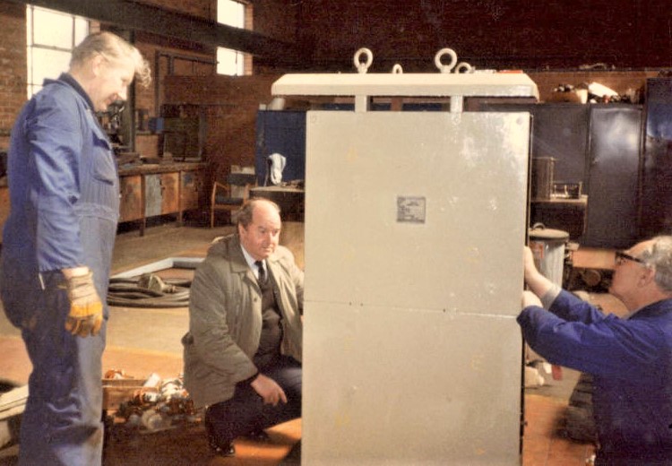 John Llewellyn, Newton Thomas and George Morgan overhauling a crane hoist motor resistance bank.