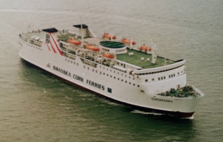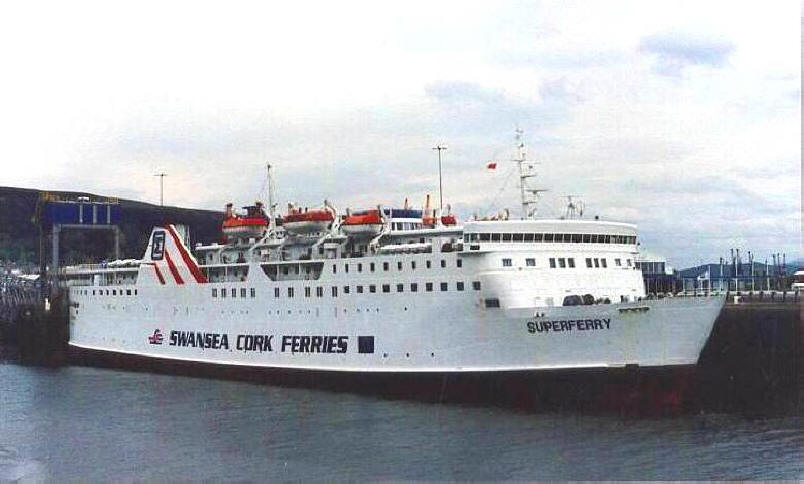 The second company to operate a ferry link between Swansea and Cork was Swansea Cork Ferries Ltd., whose service began in 1987 with the ferry ‘Celtic Pride’. The ‘Celtic Pride’ returned for the 1988 season but was unavailable for charter the following year, so there was no service in 1989. The ‘Ionian Sun’ (formerly B&I’s ‘Leinster’) was chartered for the 1990 season, after which the refitted ‘Celtic Pride’ returned for seasons 1991 and 1992. The Japanese-built ‘Superferry’ was introduced in 1993 and operated through to the end of the service in 2006, other than during the 2001 season when the ‘City of Cork’ was chartered. Below is a selection of photographs of the ships operated by Swansea Cork Ferries Ltd:-