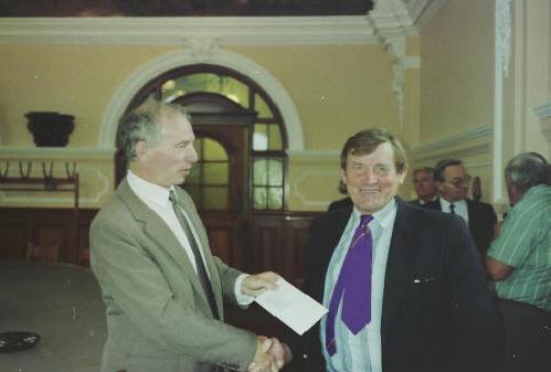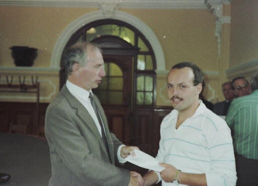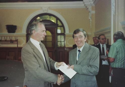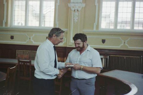 In the photos below, the severance cheques are presented by Ray Klinck, Port Manager, and John Pope, Port Engineer.