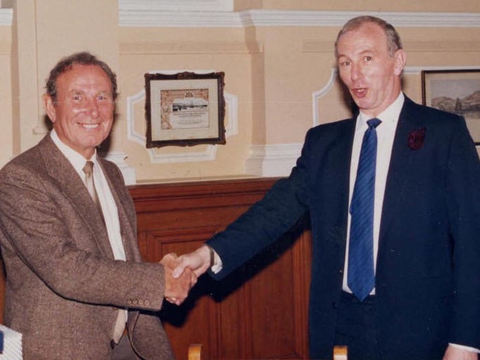 Ben Spanner receives the gift of a barometer in 1991 upon leaving Swansea to take up the post of Port Engineer at Newport Docks Left to right:- Ray Klinck (Port Manager), Mike Ingamells, Norman Ace, John Pope, Ingrid Davies, Gwylim Price, Phil Jones, Terry Morgan, Bill Davies, Nick Ridehalgh, Bill Tomkins, anon., Gerald Sansom, Ivor Lewis, Jeff Manning, anon., Roy Griffiths, Dave Saunders and Terry Duff.