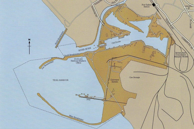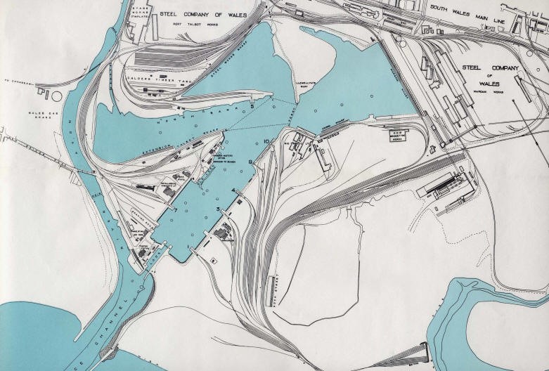 Port Talbot Docks in 1930. The additional dock area and new lock entrance shown on the map were completed in 1898.