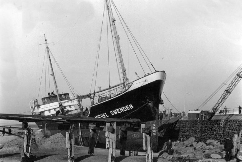 Pictured above is the Dutch coaster ‘Michel Swenden’, driven ashore alongside the North Pier, Aberavon, on the morning of Saturday, 2nd February 1957. Several efforts to refloat the vessel that evening and the following day were thwarted due to the tow-ropes parting on each occasion. However, on the p.m. high tide of Monday, 4th May she was successfully towed clear of the sands and put into Port Talbot Dry Dock for inspection.