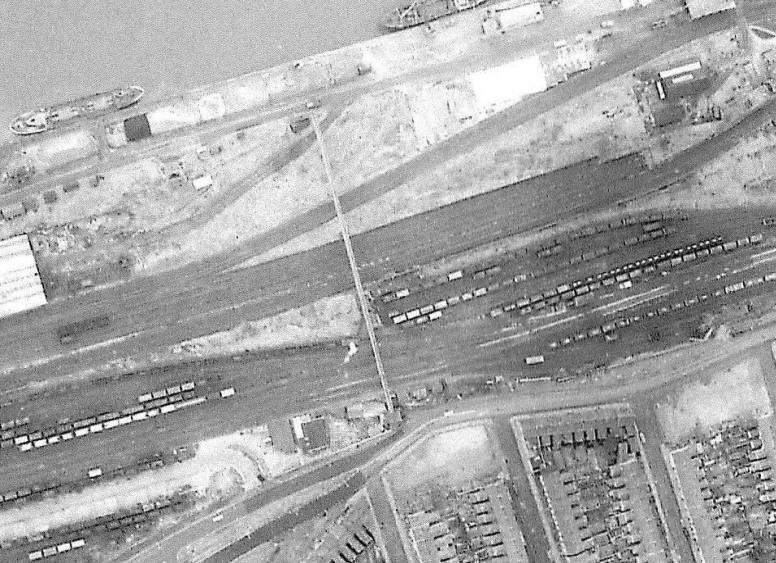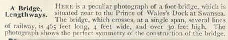Aerial view of the monkey bridge. It spanned from the main road to the wharf of Prince of Wales Dock.