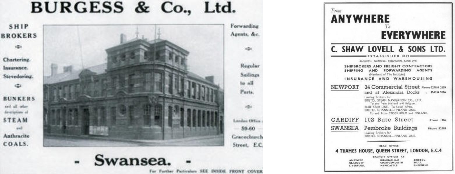 At one time there would have been around twenty shipping agents operating in the Port of Swansea – some of them now almost forgotten, such as Henry Bath, F H Tucker, T R W Mason, Richards Turpin, Simpson Bros., Coast Lines, Ambrose Davies & Matthews and Strick Gorchs. Others remembered from the more recent past include Burgess & Co., T H Couch, Bethell Gwyn (later Escombe/Inchcape), Cory Bros., Stockwood Rees, C Shaw Lovell, Stone & Rolfe, Sir James German and Adolf Nielsen.