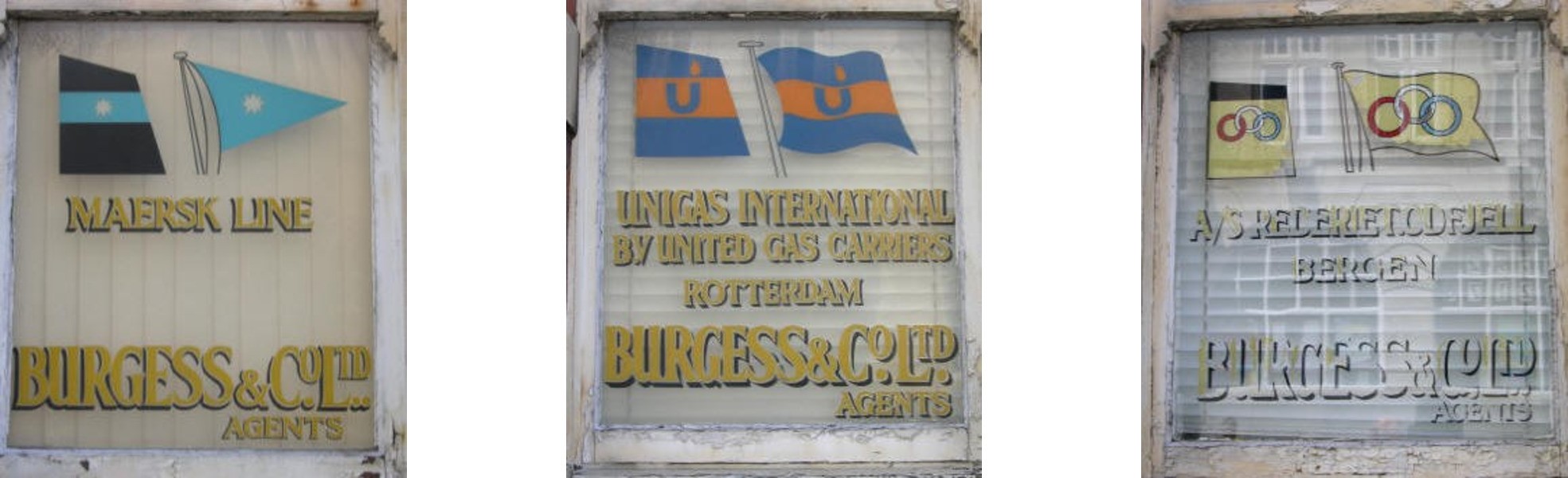 The photos below are of Burgess & Co.'s former office building in Cambrian Place, Swansea, and show some of the windows advertising the various shipping lines for which they were agents.