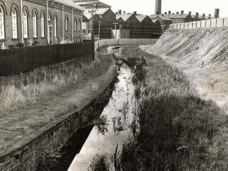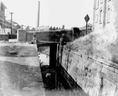 Bridge over canal to the entrance of the Vivian's Copper Works. The stack in the background is the Morfa Copper Works