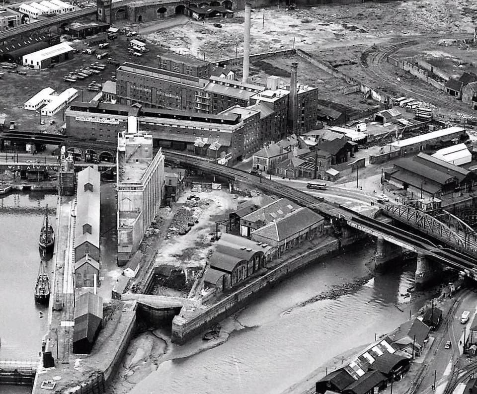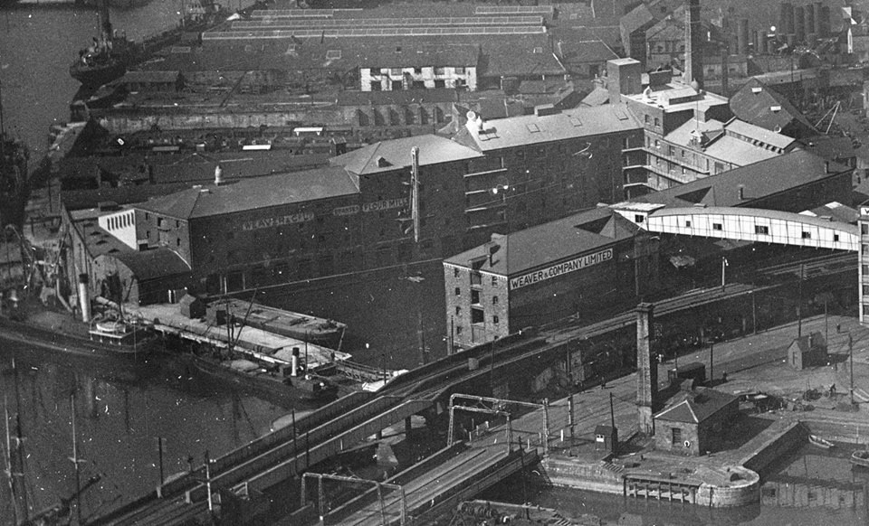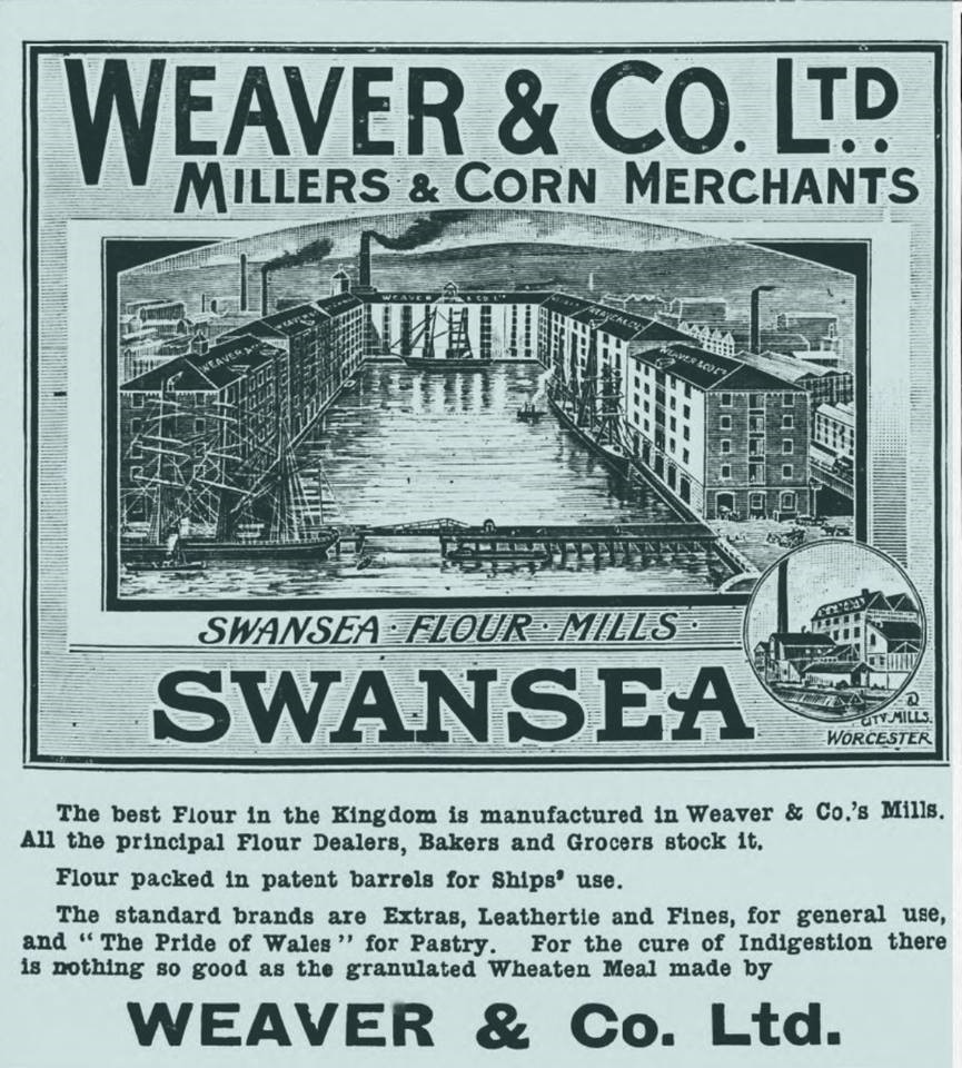 The Weavers building was a flour mill and corn storage depot. It was designed and built by the French engineer Francois Hennebique in 1897, the first reinforced concrete building in Europe. It was demolished in 1984 in preparation for the Sainsburys development. A commemorative plaque and column from the old building stand on the Tawe footpath near the New Cut bridge.